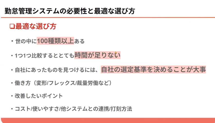 ご視聴いただいた方は振り返りとして、見逃した方は勤怠管理システムを選定するヒントとしてご活用ください。