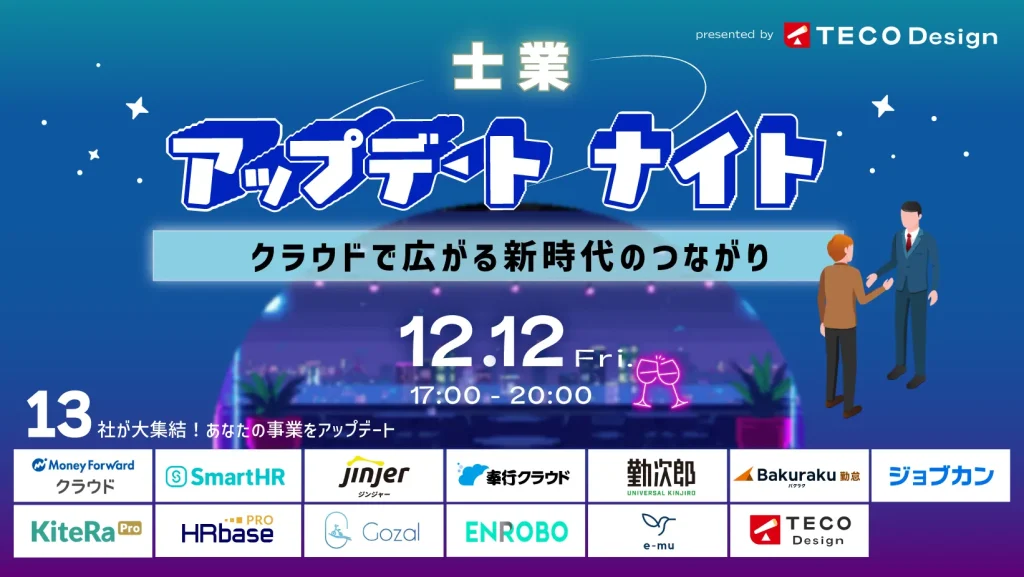 株式会社HRbase、株式会社オービックビジネスコンサルタント、株式会社KiteRa、勤次郎株式会社、株式会社Gozal、jinjer株式会社、株式会社SmartHR、株式会社Donuts、株式会社マネーフォワード、Liber&X株式会社、株式会社LayerX、社会保険労務士法人WILL、株式会社nexus